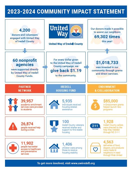 The United Way of Iredell County fights for the health, education and financial stability of every person in Iredell County.  Our core function is to identify, connect and resource those programs and services that have an established track record of lifting families and individuals onto that cycle of success.