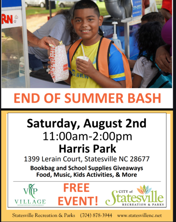 Be Well Iredell will host a table at the End of Summer Bash sponsored by Village Intervention Partnership and City of Statesville Recreation & Parks. Volunteers will assist in setting up the table, tearing down, managing the table, and engaging with attendees. A basic understanding of Be Well Iredell's mission and strong interpersonal skills are helpful.